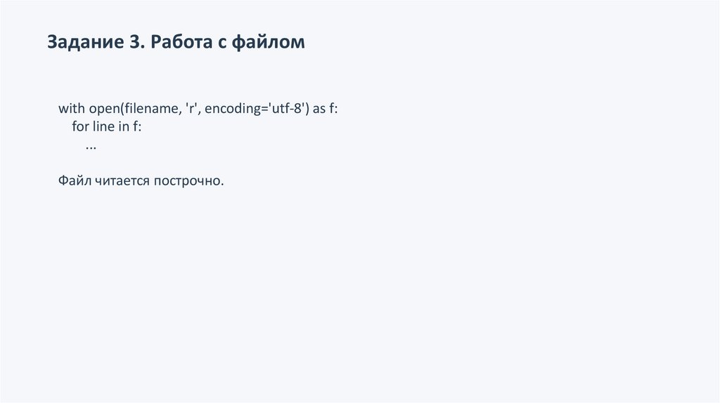 Задание 3. Работа с файломwith open(filename, 'r', encoding='utf-8') as f: