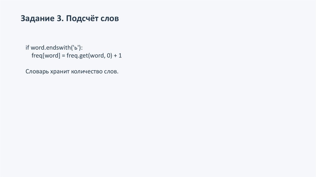Задание 3. Подсчёт словif word.endswith('ь'):