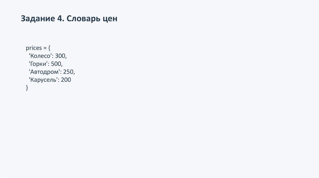 Задание 4. Словарь ценprices = {