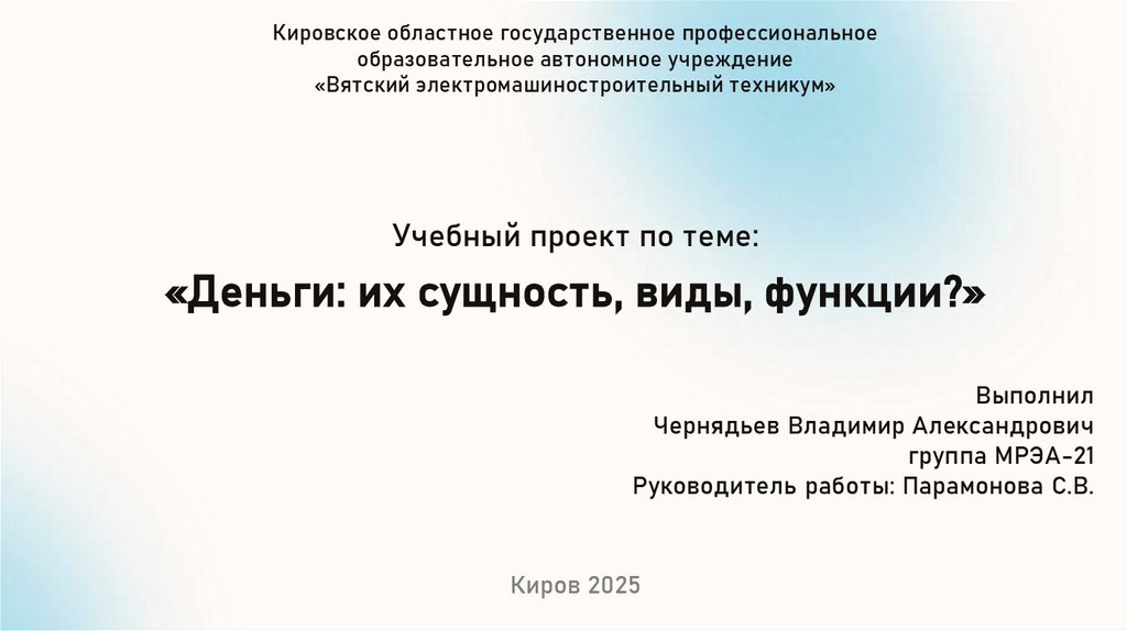 Цель проекта:Изучить сущность денег, их функции и виды, а