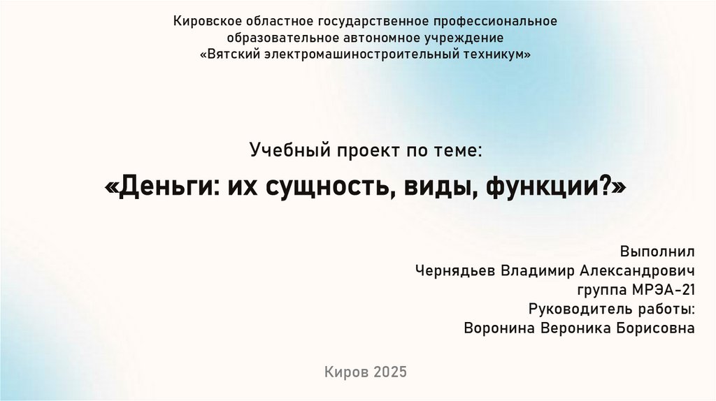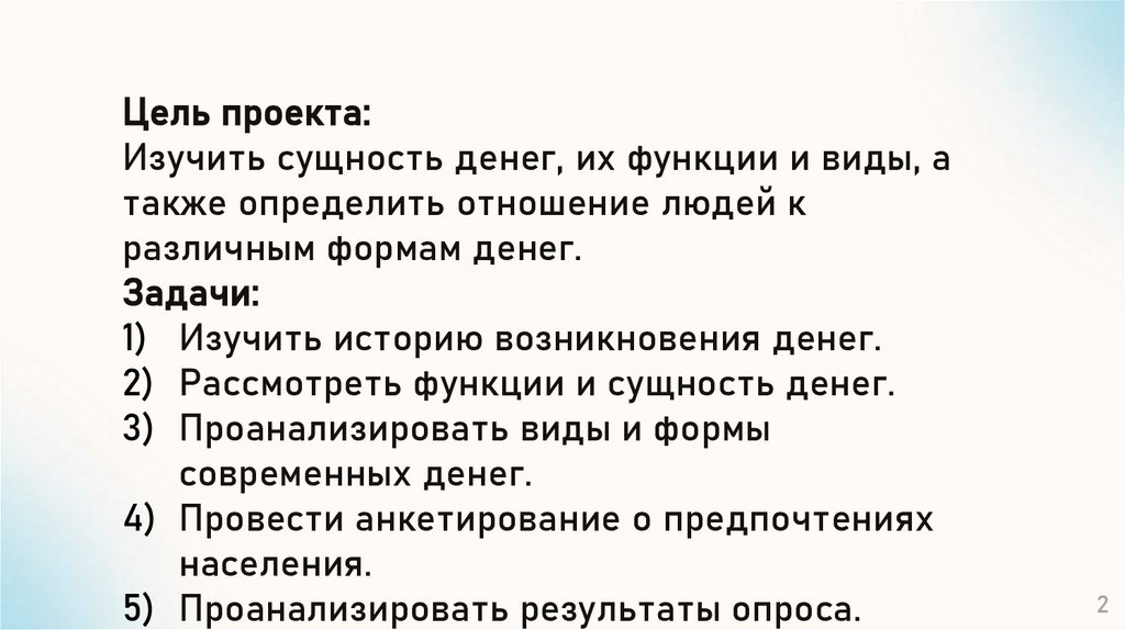 Цель проекта:Изучить сущность денег, их функции и виды, а