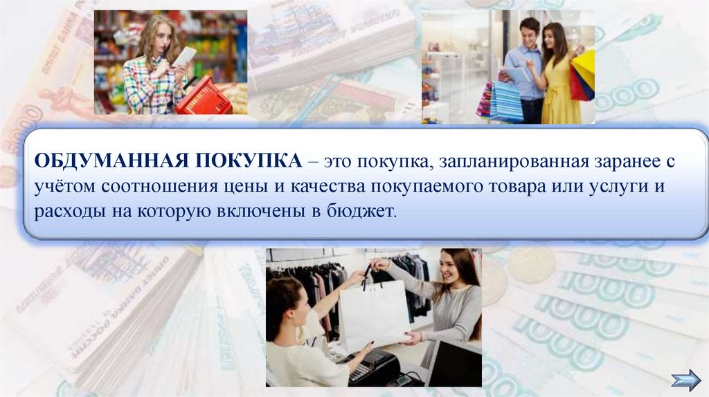ОБДУМАННАЯ ПОКУПКА – это покупка, запланированная заранее сучётом соотношения цены и качества покупаемого товара или услуги и