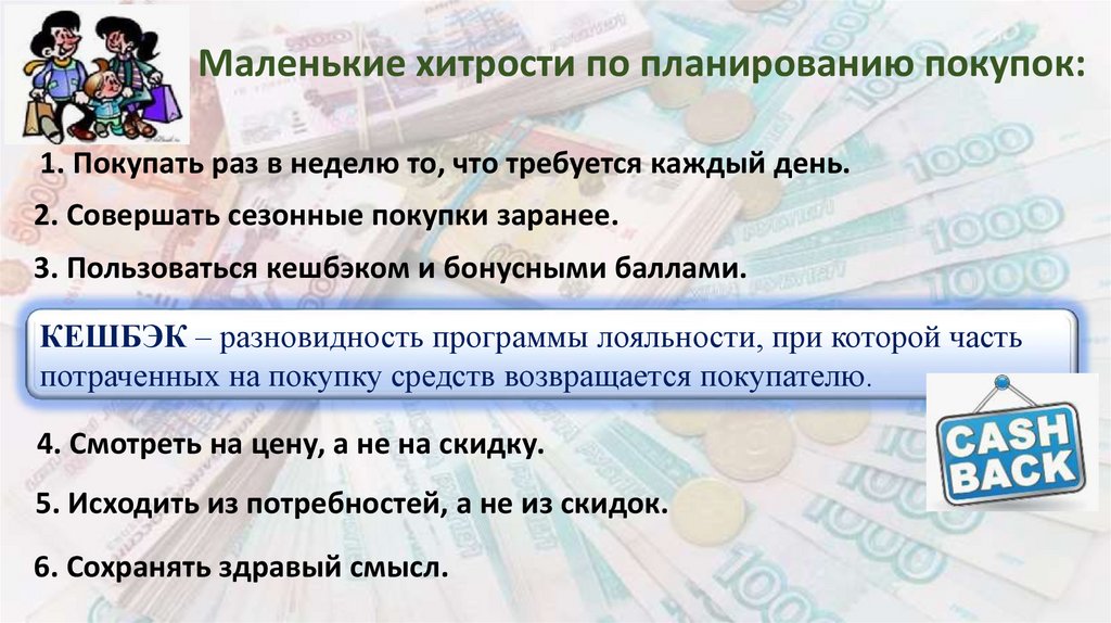 Маленькие хитрости по планированию покупок:1. Покупать раз в неделю то, что требуется каждый день.