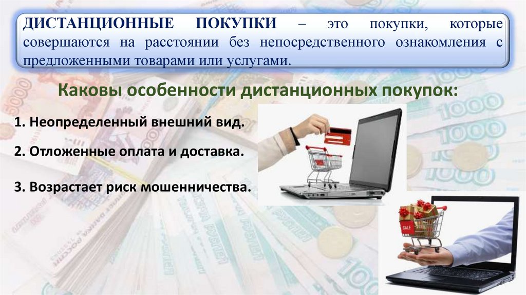 ДИСТАНЦИОННЫЕ ПОКУПКИ – это покупки, которыесовершаются на расстоянии без непосредственного ознакомления с