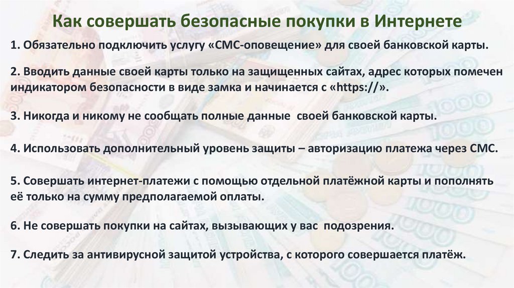 Как совершать безопасные покупки в Интернете1. Обязательно подключить услугу «СМС-оповещение» для своей банковской карты.