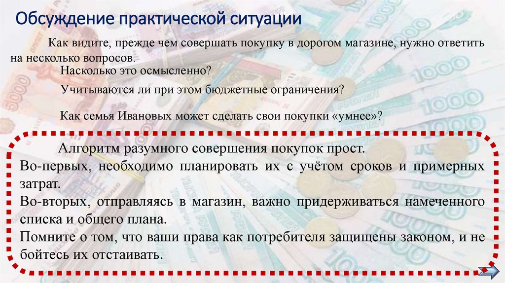 Обсуждение практической ситуацииКак видите, прежде чем совершать покупку в дорогом магазине, нужно ответить