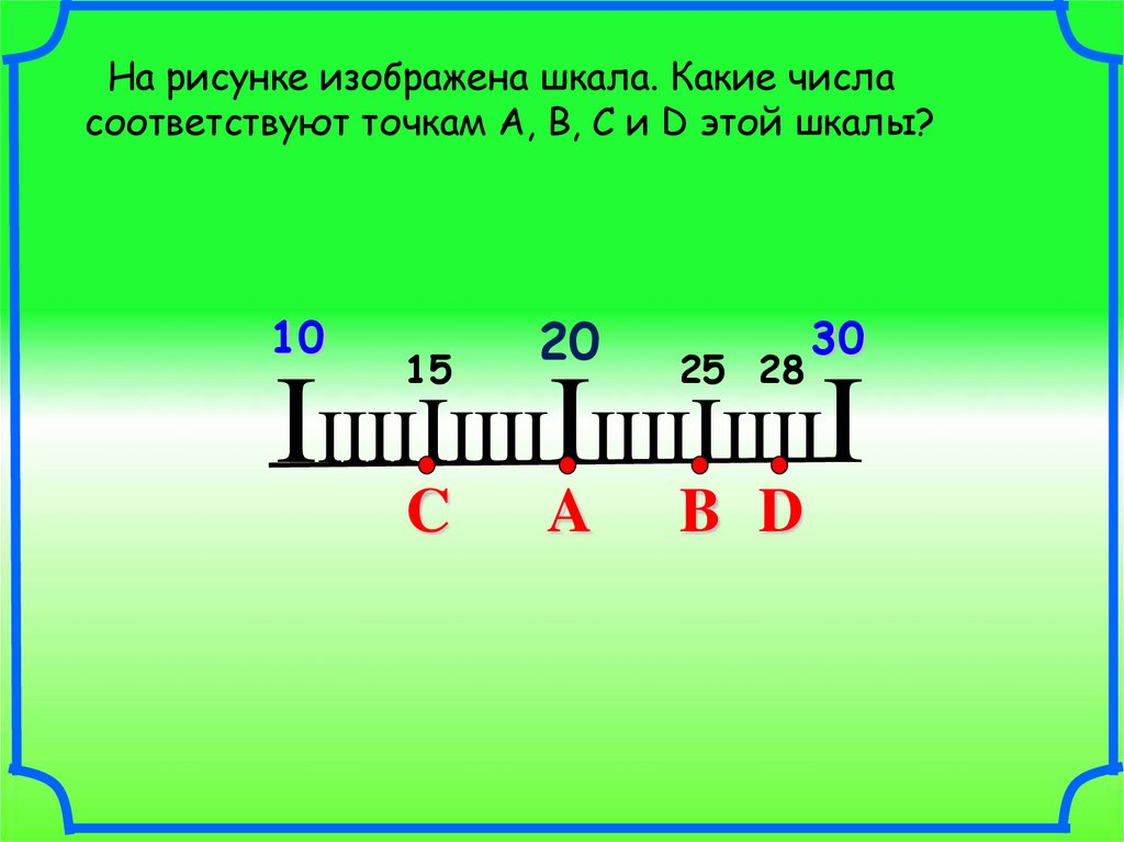 На рисунке изображена шкала. Какие числасоответствуют точкам А, В, С и D этой шкалы?