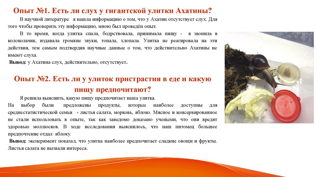 Опыт №1. Есть ли слух у гигантской улитки Ахатины?В научной литературе я нашла информацию о том, что у Ахатин отсутствует слух. Для