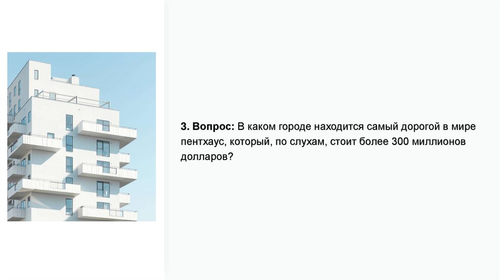 3. Вопрос: В каком городе находится самый дорогой в мирепентхаус, который, по слухам, стоит более 300 миллионов