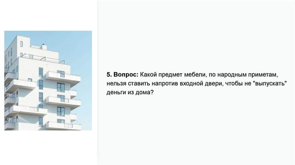 5. Вопрос: Какой предмет мебели, по народным приметам,нельзя ставить напротив входной двери, чтобы не "выпускать"