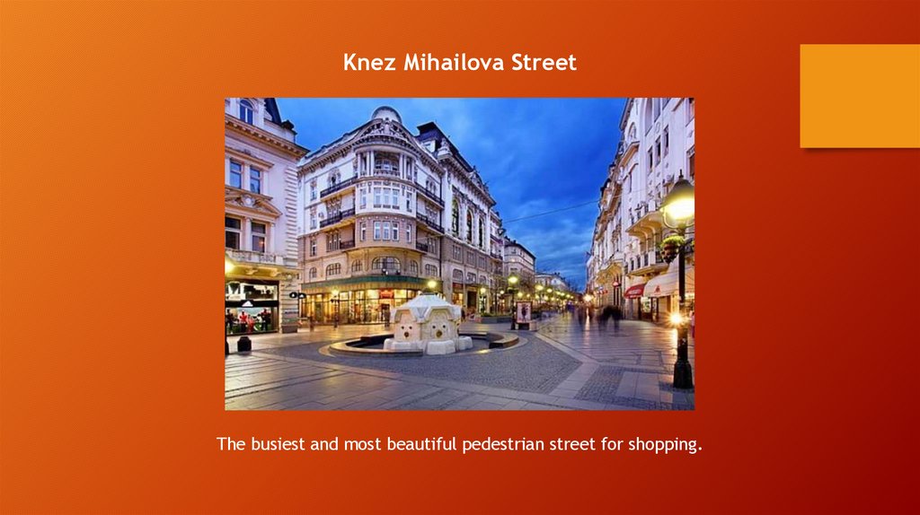 Knez Mihailova StreetThe busiest and most beautiful pedestrian street for shopping.