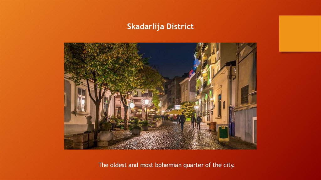 Skadarlija DistrictThe oldest and most bohemian quarter of the city.