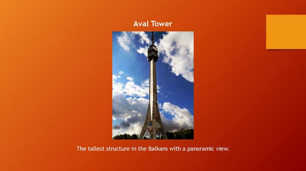 Aval TowerThe tallest structure in the Balkans with a panoramic view.