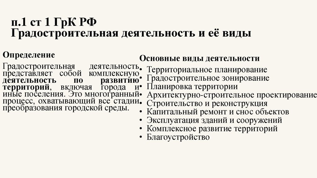 п.1 ст 1 ГрК РФГрадостроительная деятельность и её виды