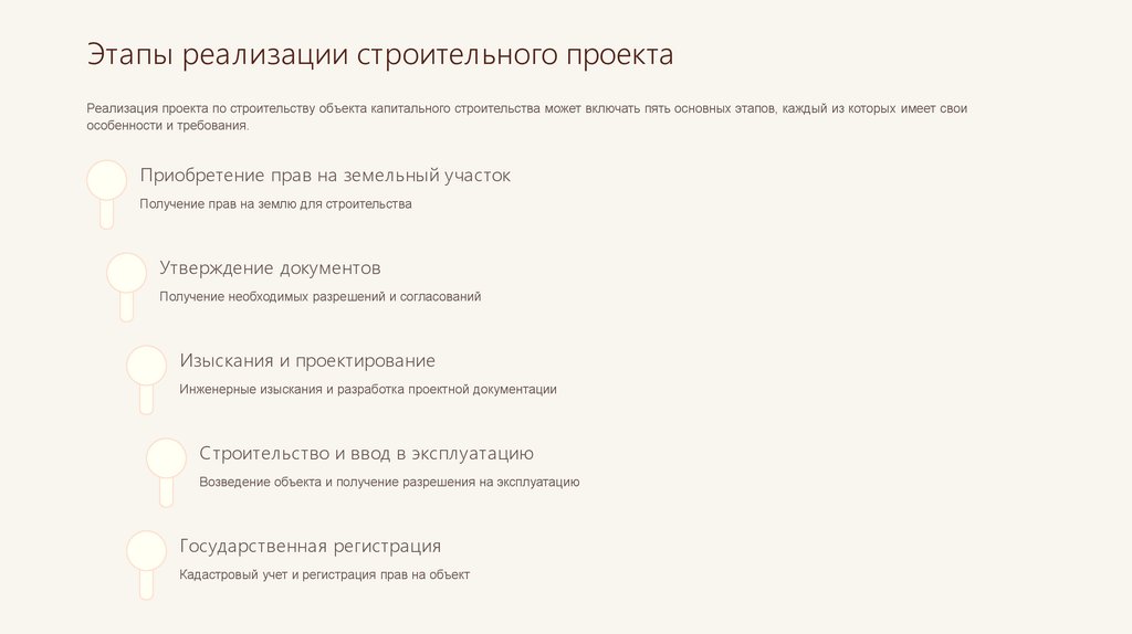 Этапы реализации строительного проектаРеализация проекта по строительству объекта капитального строительства может включать пять основных этапов, каждый из которых имеет свои