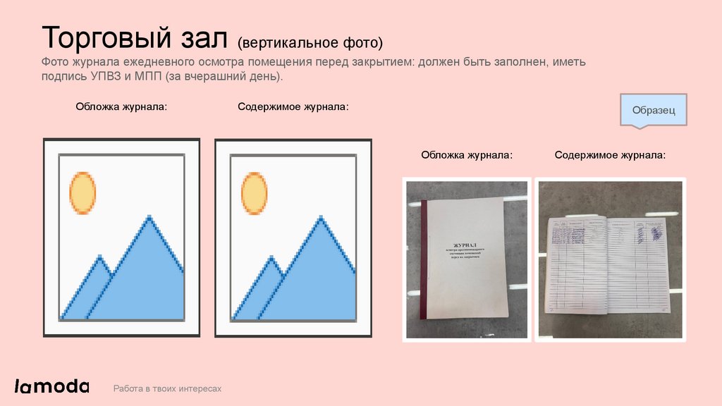 Торговый зал (вертикальное фото)Фото журнала ежедневного осмотра помещения перед закрытием: должен быть заполнен, иметь