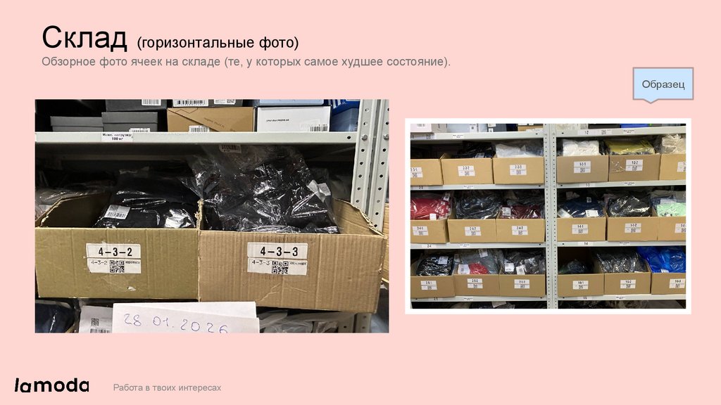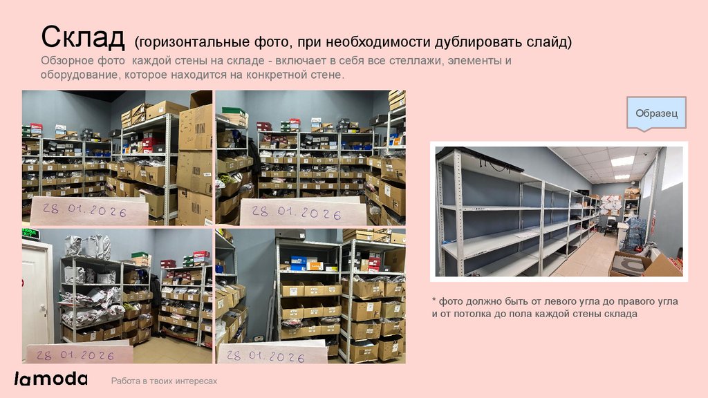 Склад (горизонтальные фото, при необходимости дублировать слайд)Обзорное фото каждой стены на складе - включает в себя все стеллажи, элементы и