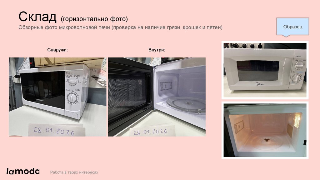 Склад (горизонтально фото)Обзорные фото микроволновой печи (проверка на наличие грязи, крошек и пятен)