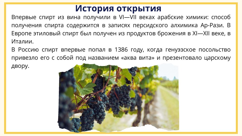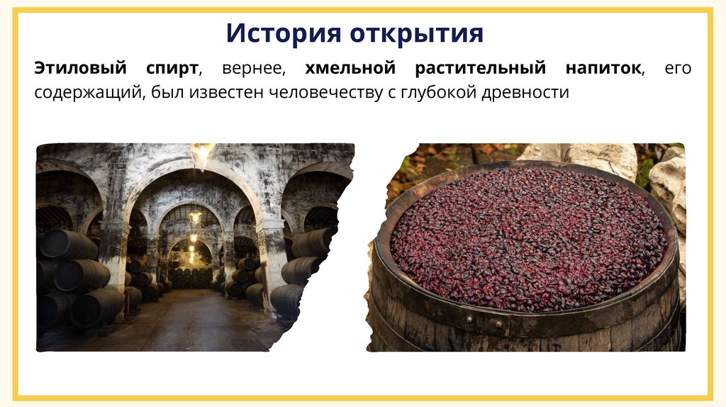 История открытияЭтиловый спирт, вернее, хмельной растительный напиток,