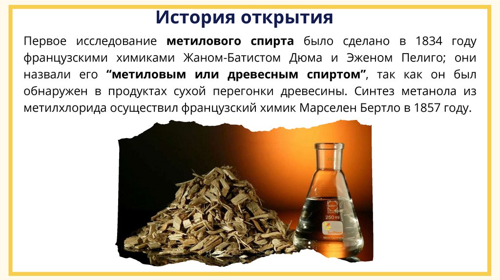 История открытияПервое исследование метилового спирта было сделано в 1834 году