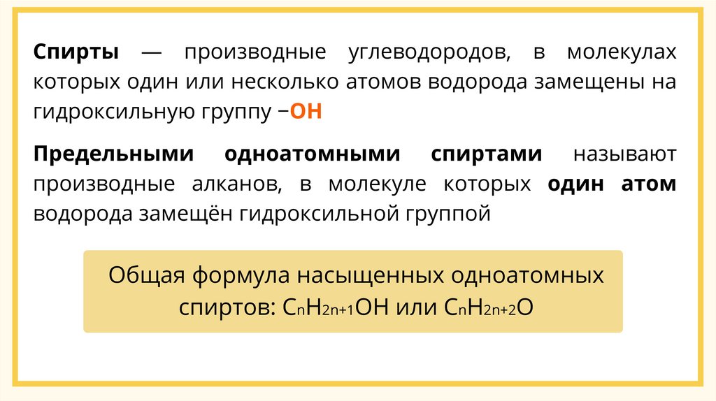 Спирты — производные углеводородов, в молекулахкоторых один или несколько атомов водорода замещены на