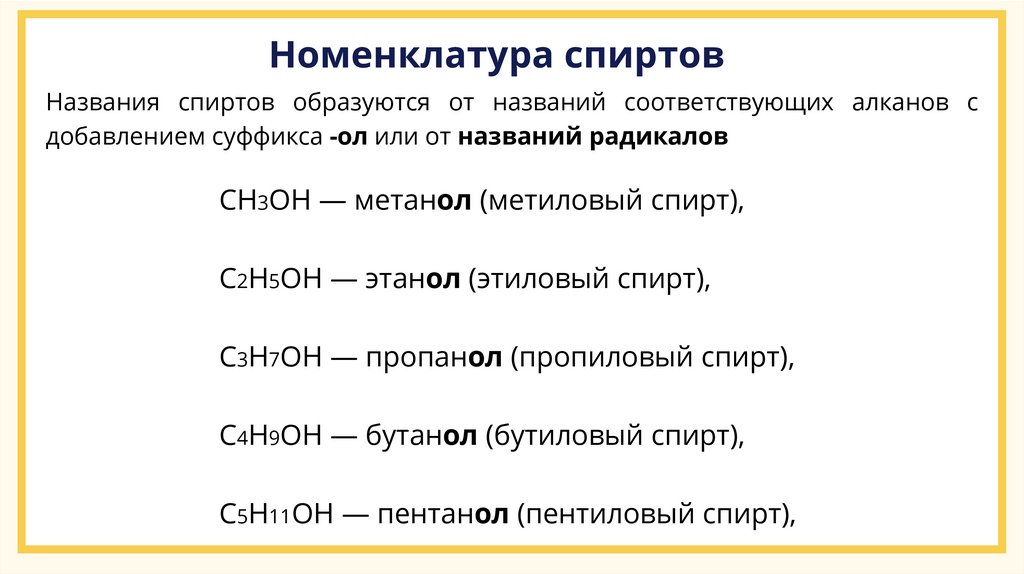 Номенклатура спиртовНазвания спиртов образуются от названий соответствующих алканов с