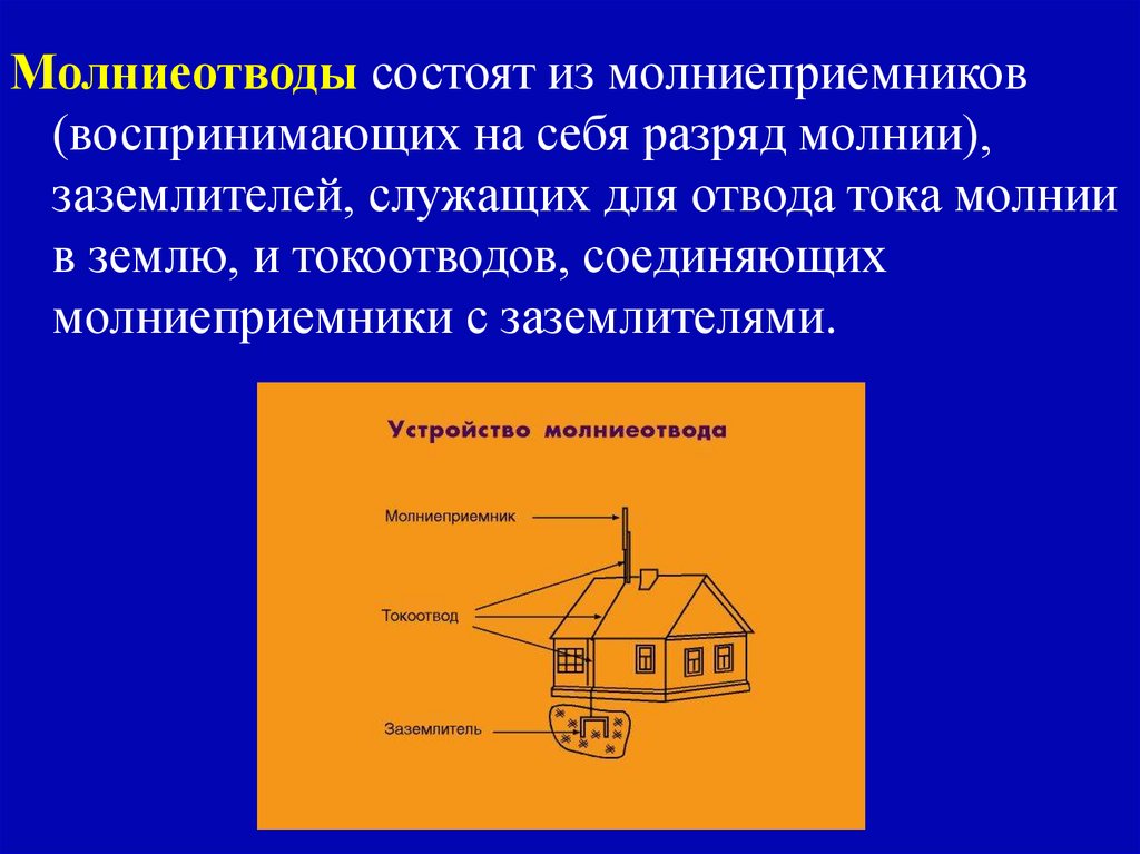 Молниеотводы состоят из молниеприемников(воспринимающих на себя разряд молнии),