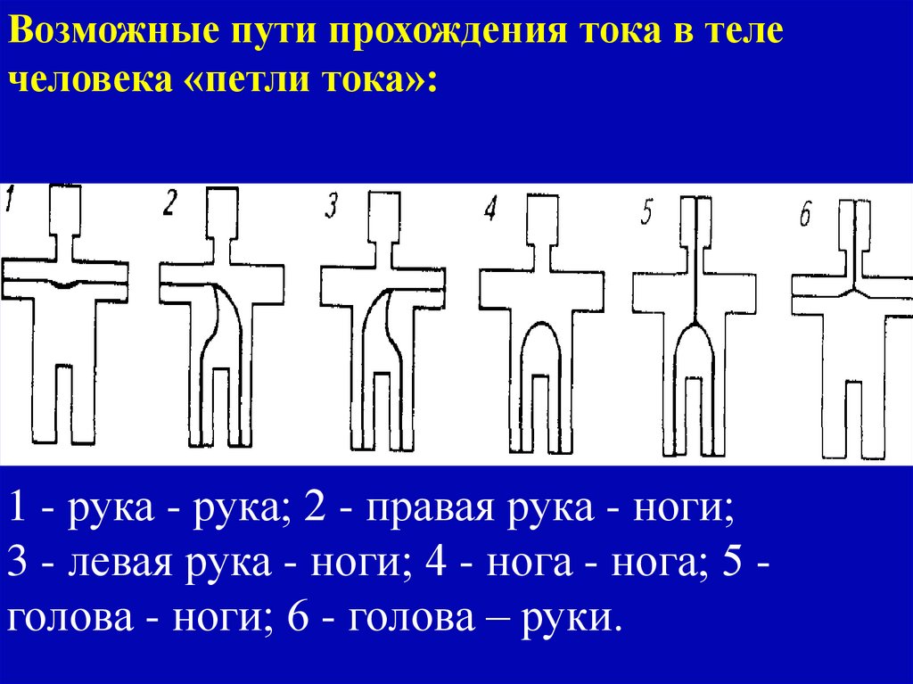 • Пути тока через тело человека;