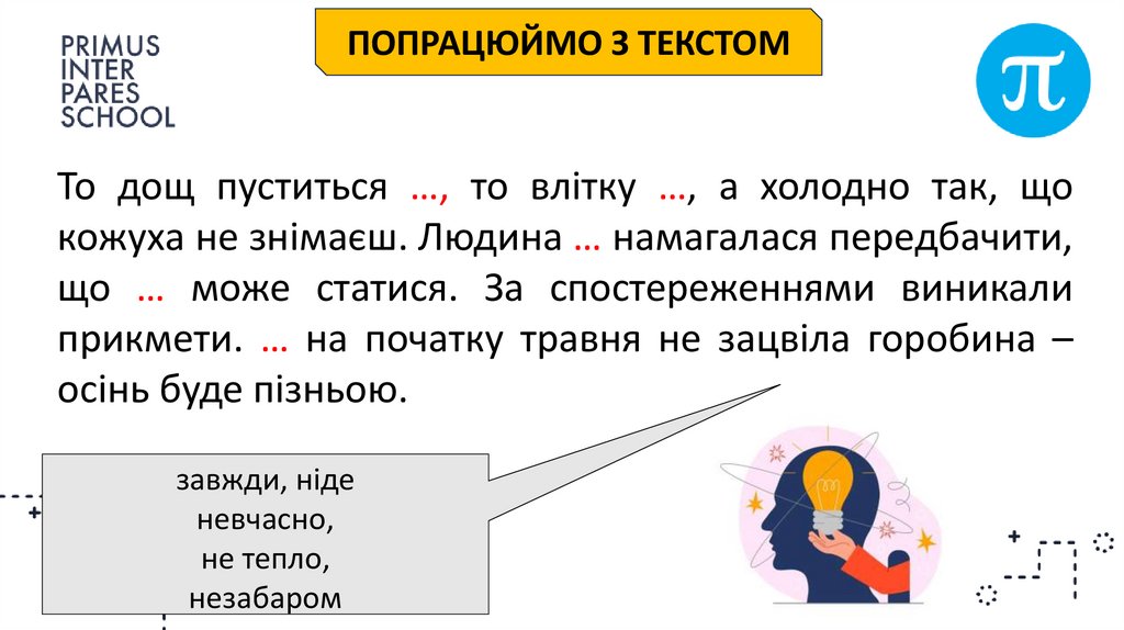 ПОПРАЦЮЙМО З ТЕКСТОМТо дощ пуститься …, то влітку …, а холодно так, що