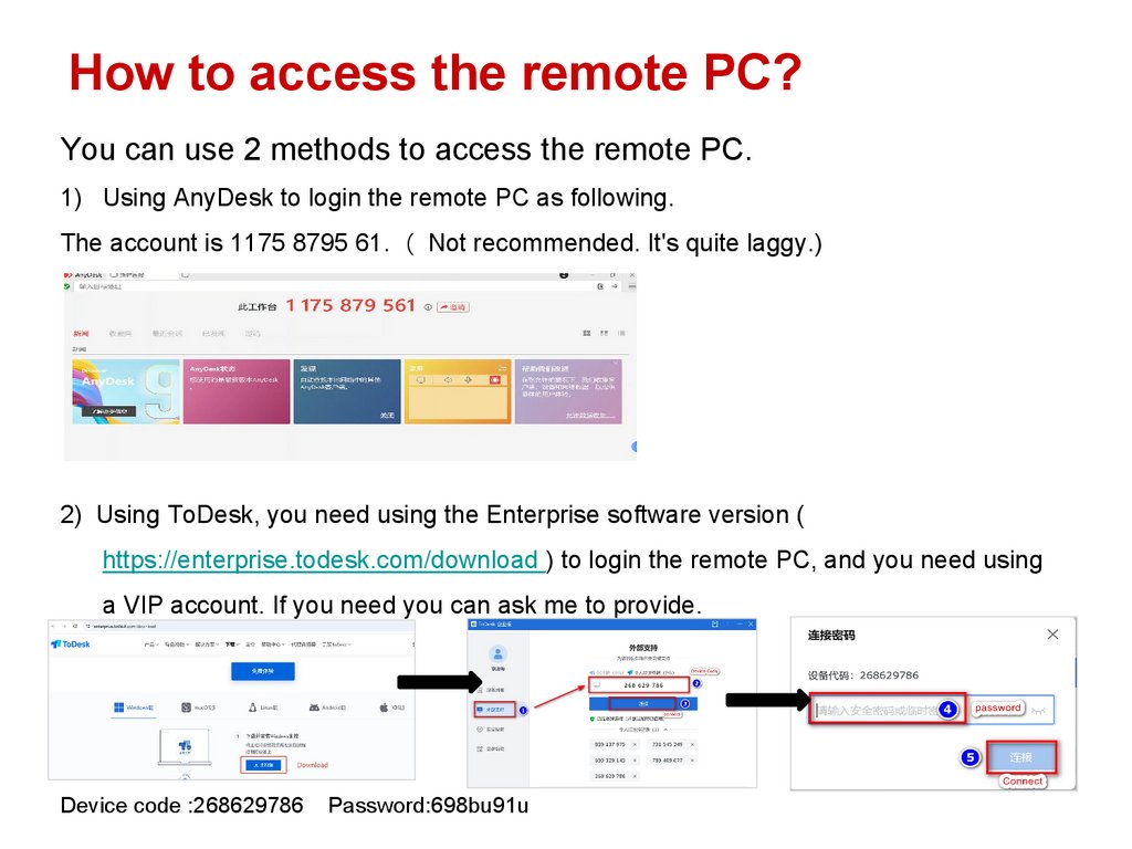 How to access the remote PC?You can use 2 methods to access the remote PC.