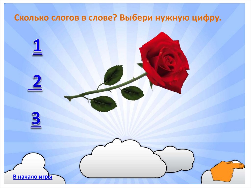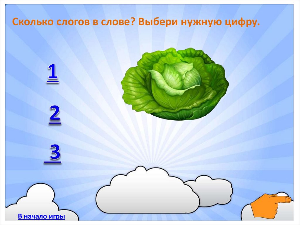 Сколько слогов в слове? Выбери нужную цифру.В начало игры