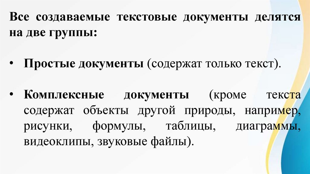 Все создаваемые текстовые документы делятсяна две группы: