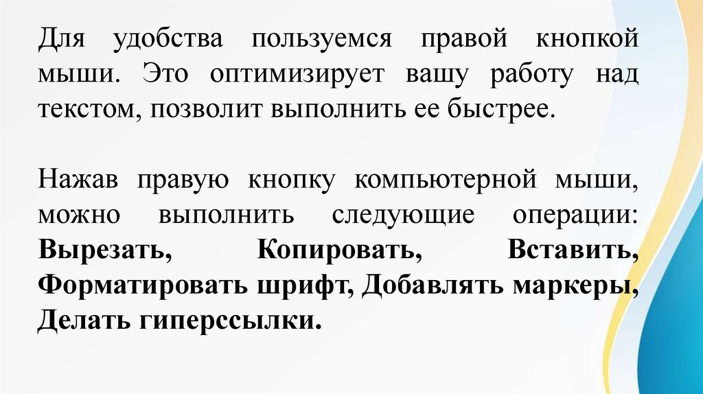 Для удобства пользуемся правой кнопкоймыши. Это оптимизирует вашу работу над