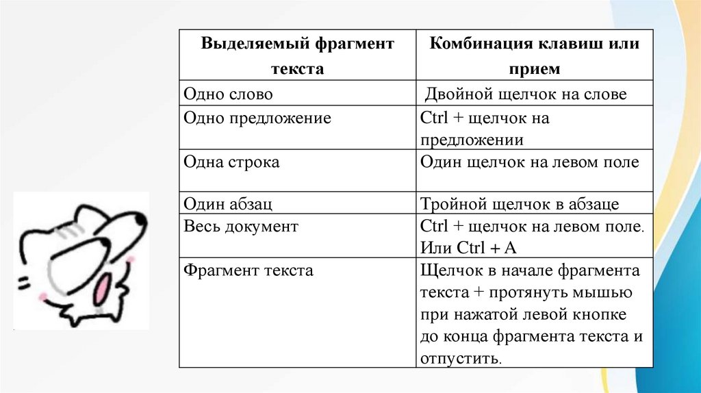 «выделить» фрагмент текста.