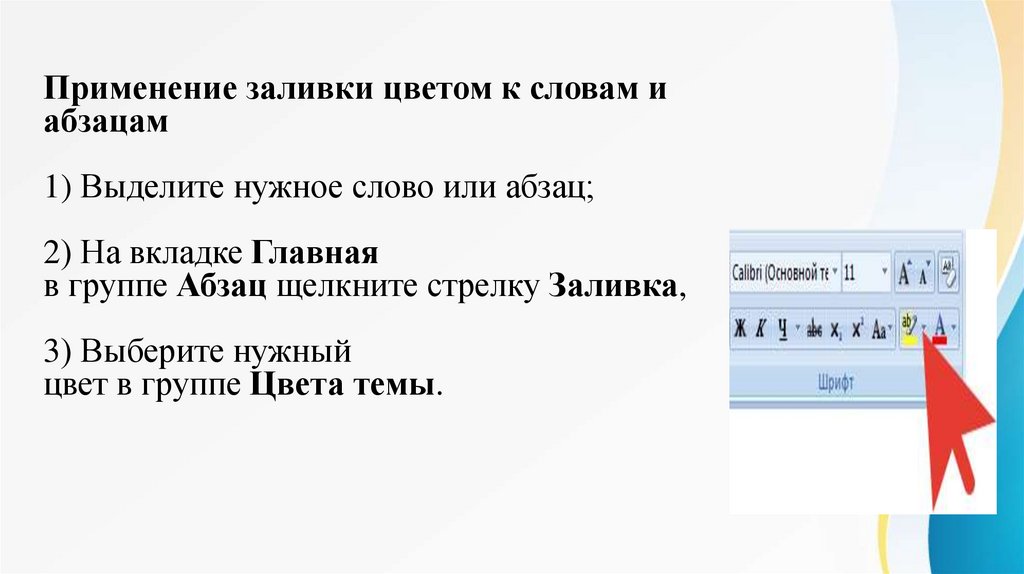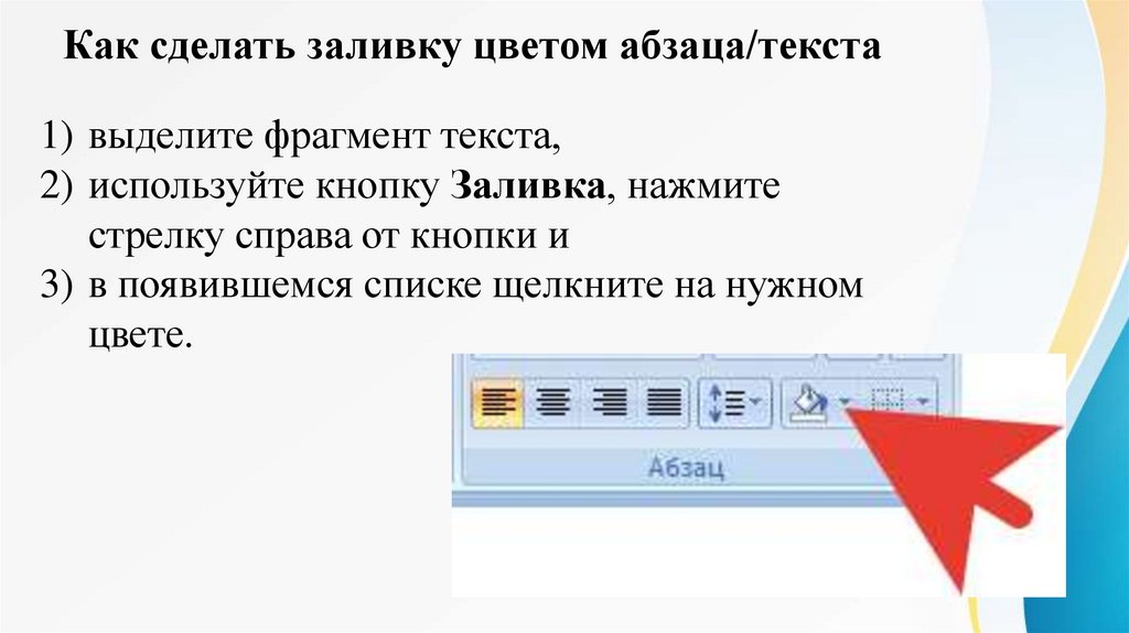 Как сделать заливку цветом абзаца/текста1) выделите фрагмент текста,