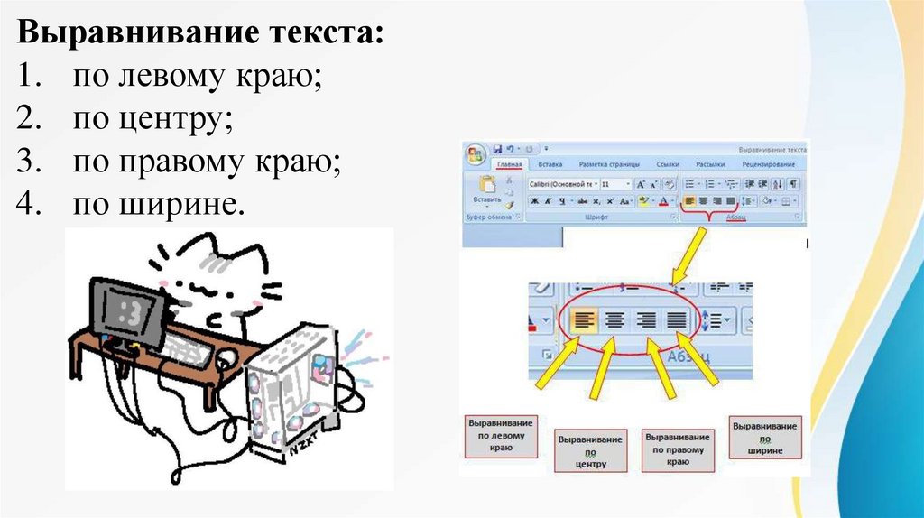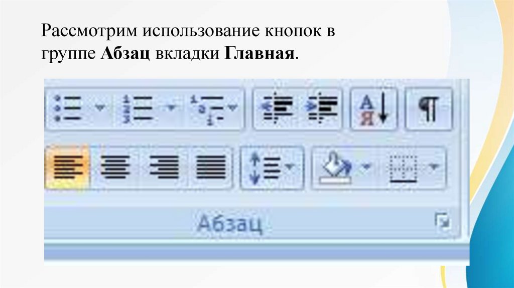 Рассмотрим использование кнопок вгруппе Абзац вкладки Главная.