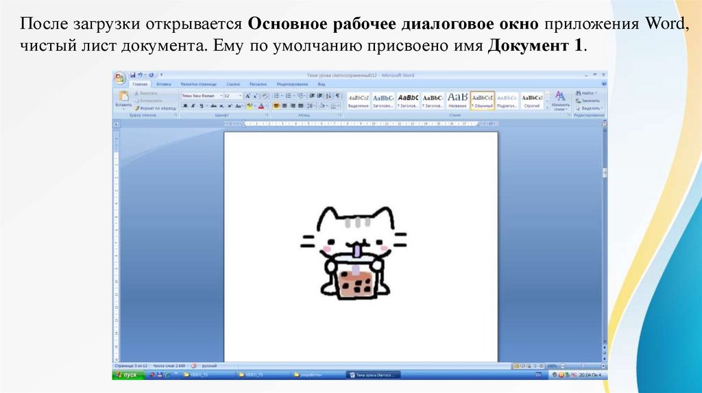 После загрузки открывается Основное рабочее диалоговое окно приложения Word,чистый лист документа. Ему по умолчанию присвоено имя Документ 1.