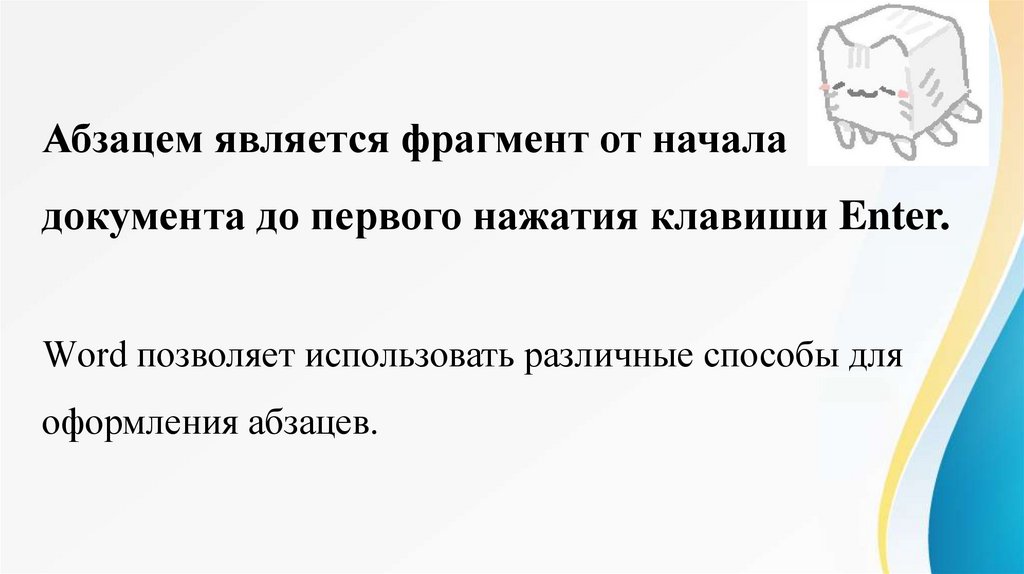 Абзацем является фрагмент от началадокумента до первого нажатия клавиши Enter.