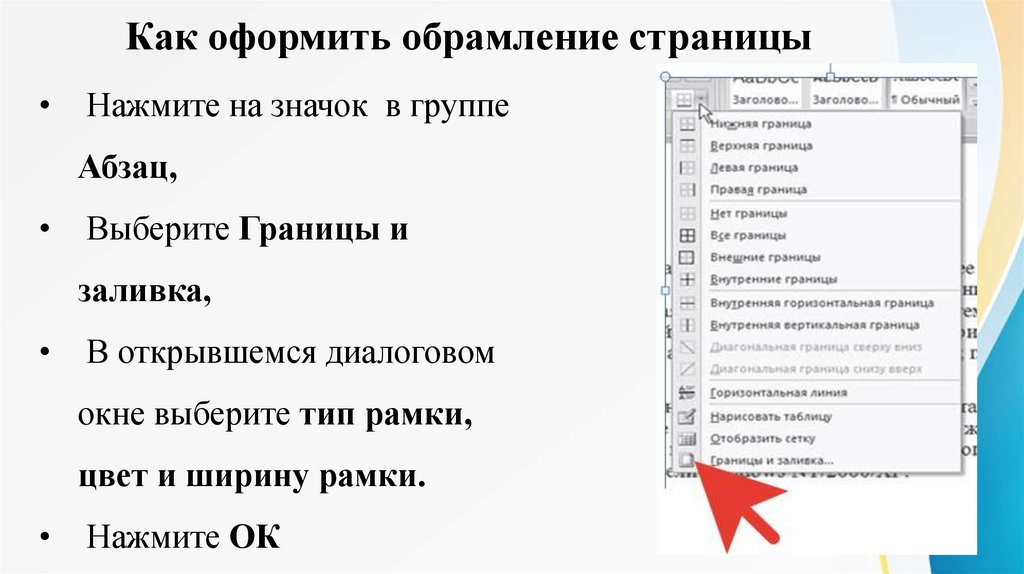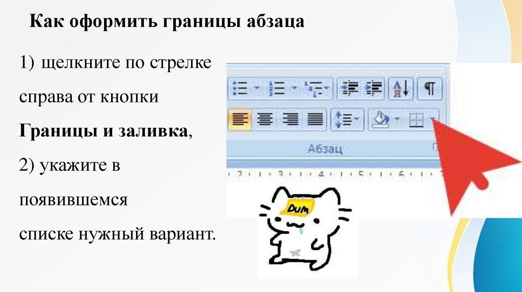 Как оформить границы абзаца1) щелкните по стрелке