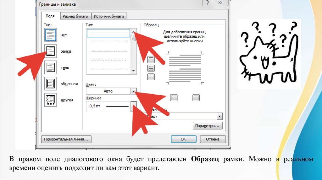 В правом поле диалогового окна будет представлен Образец рамки. Можно в реальномвремени оценить подходит ли вам этот вариант.