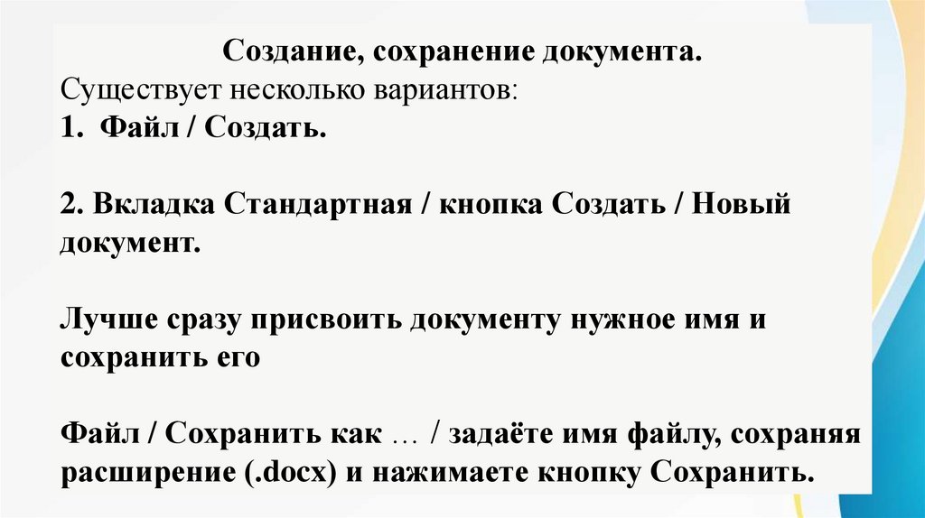Создание, сохранение документа.Существует несколько вариантов:
