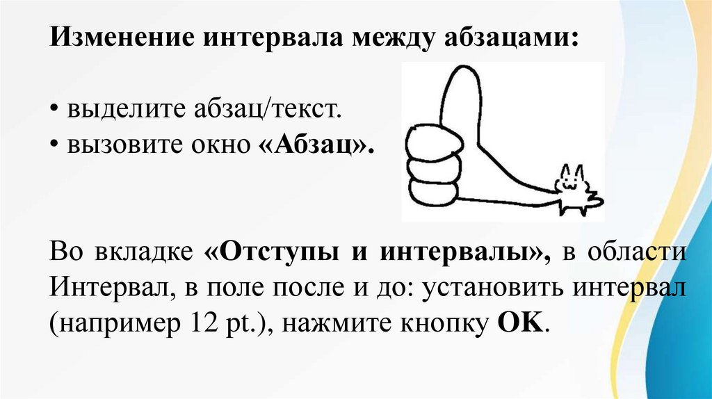 Изменение интервала между абзацами:• выделите абзац/текст.