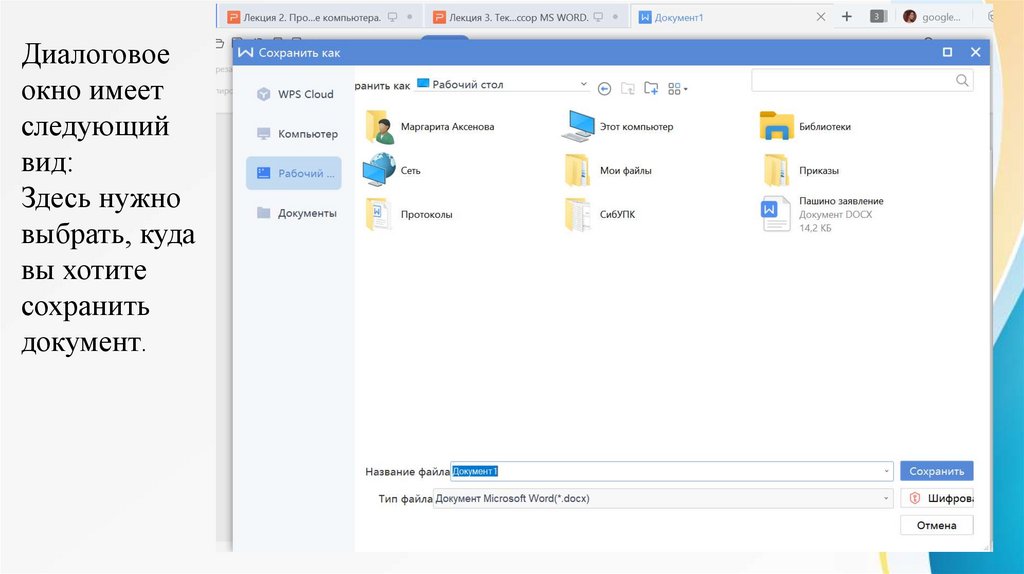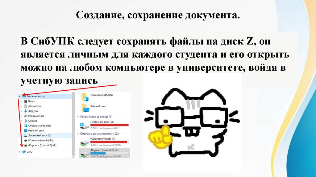 Создание, сохранение документа.В СибУПК следует сохранять файлы на диск Z, он