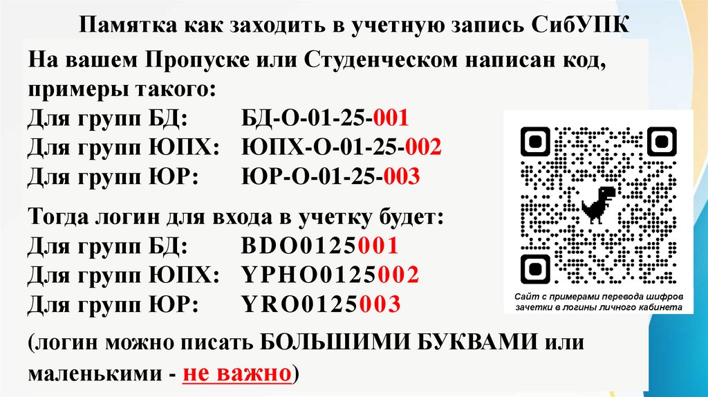Памятка как заходить в учетную запись СибУПКНа вашем Пропуске или Студенческом написан код,