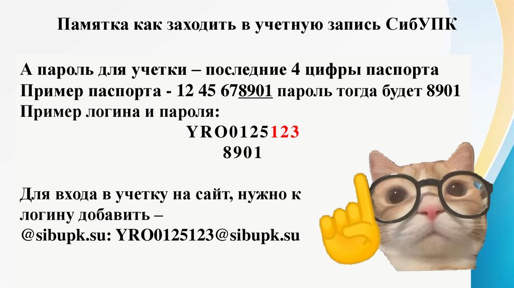 Памятка как заходить в учетную запись СибУПКА пароль для учетки – последние 4 цифры паспорта
