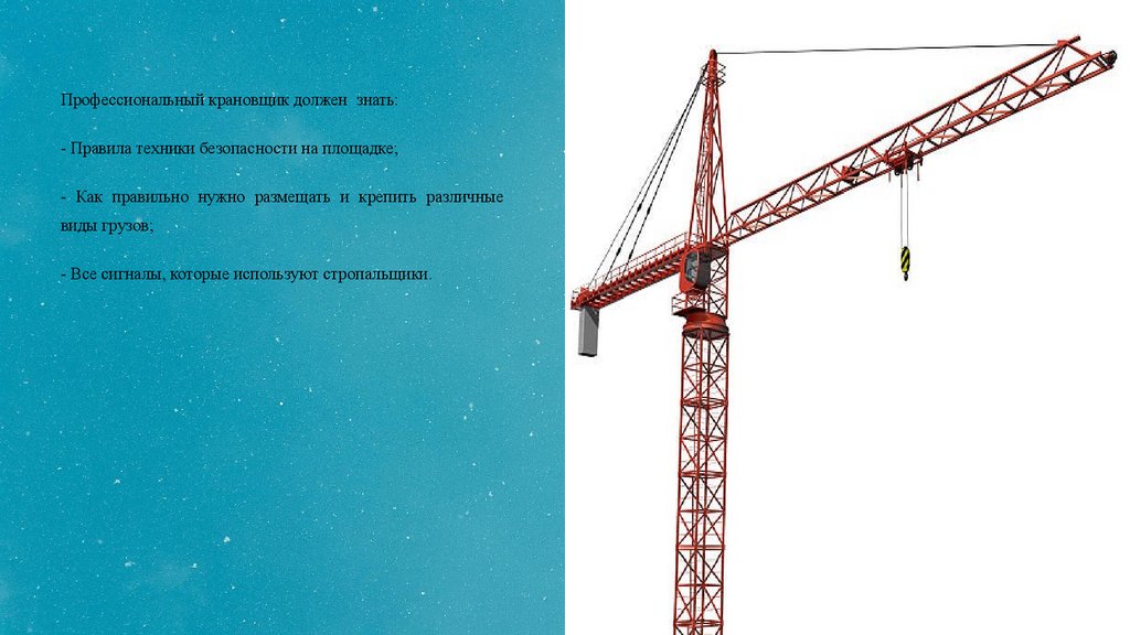 Профессиональный крановщик должен знать:- Правила техники безопасности на площадке;