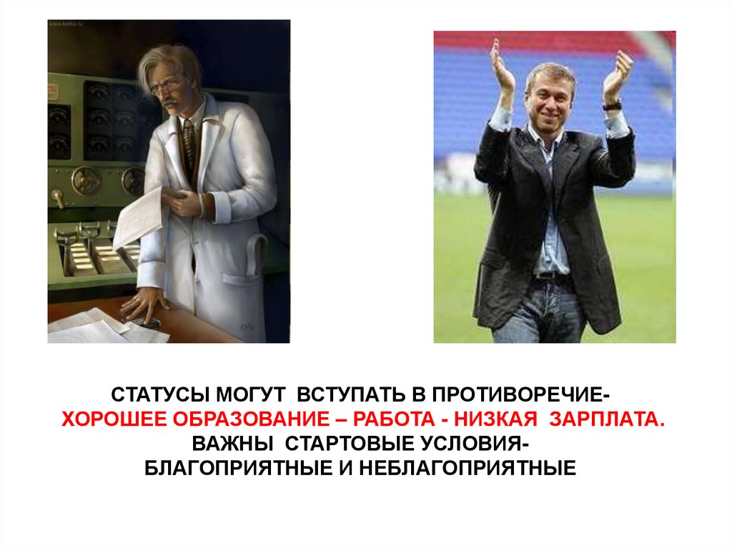 СТАТУСЫ МОГУТ ВСТУПАТЬ В ПРОТИВОРЕЧИЕХОРОШЕЕ ОБРАЗОВАНИЕ – РАБОТА - НИЗКАЯ ЗАРПЛАТА.ВАЖНЫ СТАРТОВЫЕ УСЛОВИЯБЛАГОПРИЯТНЫЕ И НЕБЛАГОПРИЯТНЫЕ