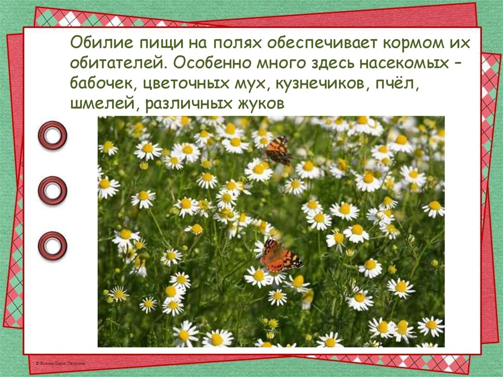 Обилие пищи на полях обеспечивает кормом ихобитателей. Особенно много здесь насекомых –