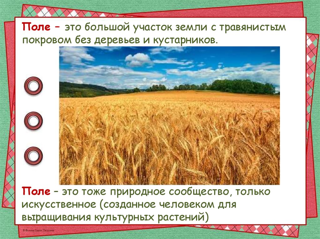 Поле – это большой участок земли с травянистымпокровом без деревьев и кустарников.