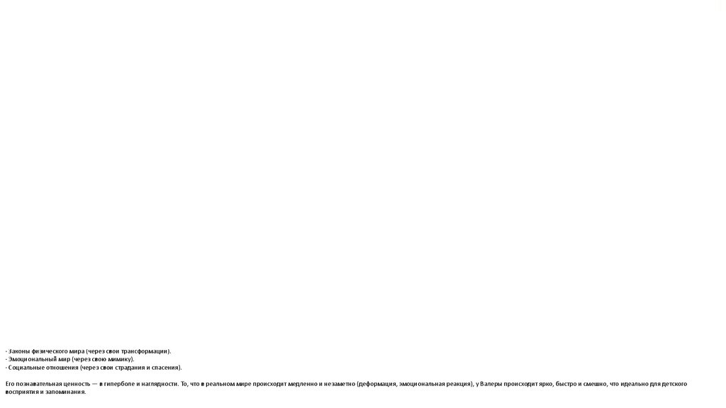 Его познавательная ценность — в гиперболе и наглядности. То, что в реальном мире происходит медленно и незаметно (деформация, эмоциональная реакция), у Валеры происходит ярко, быстро и смешно, что идеально для детского